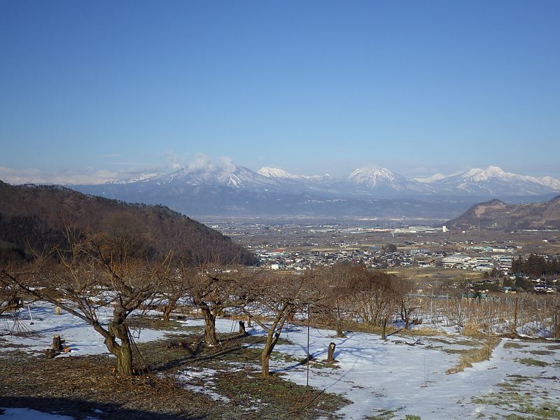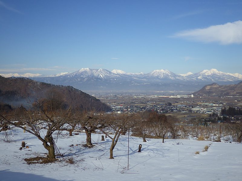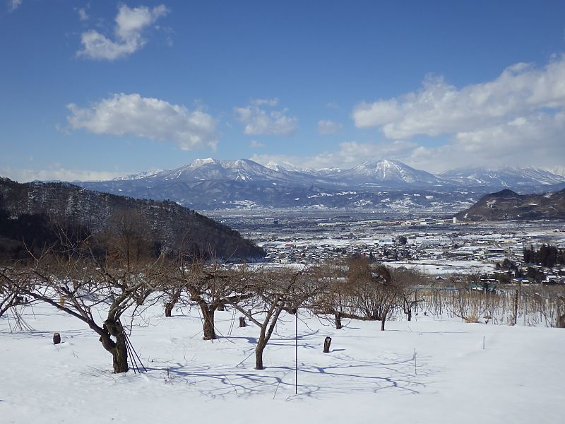 薄い雲はあるものの穏やかな冬晴れの寒の入りで北信五岳の峰が白く光っています 畑の雪は少なくスモモの剪定作業が始まっています |