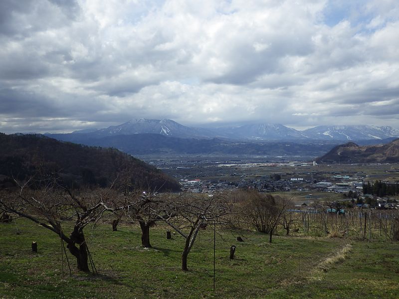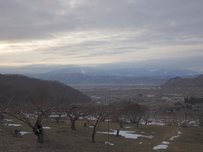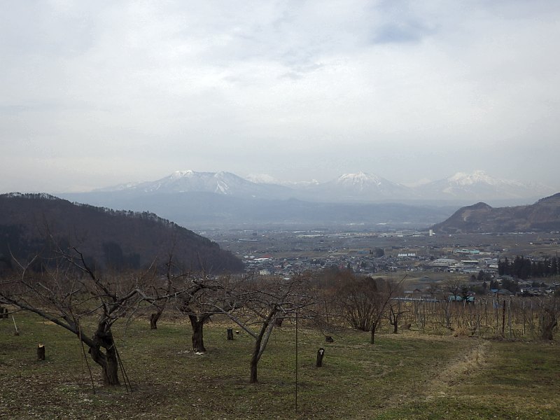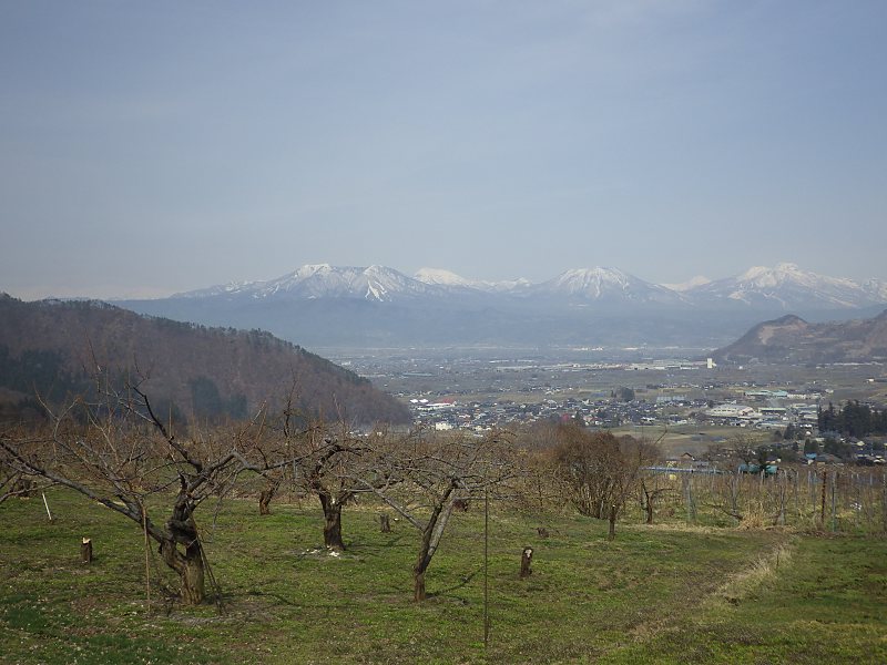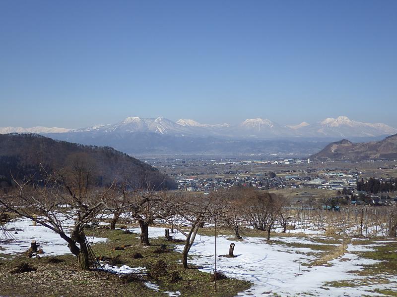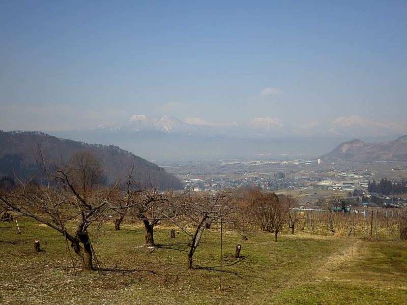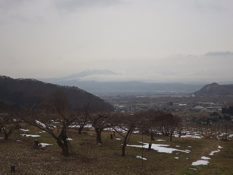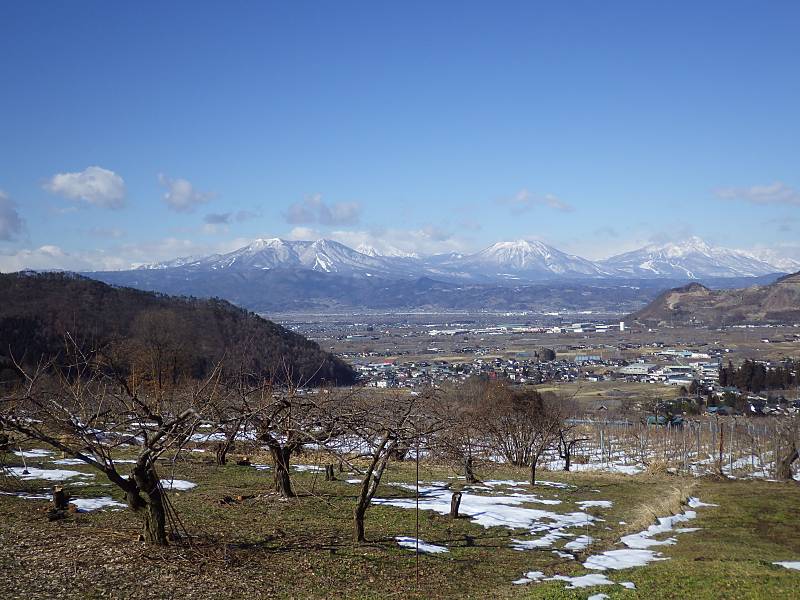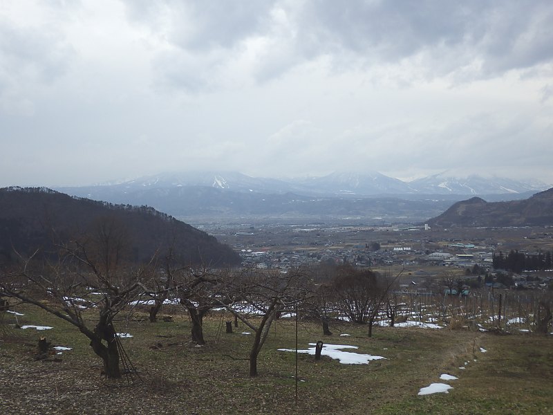 北信五岳全体が靄に覆われているような景色です ワインブドウの畑にも雪がまだ少し残っています |