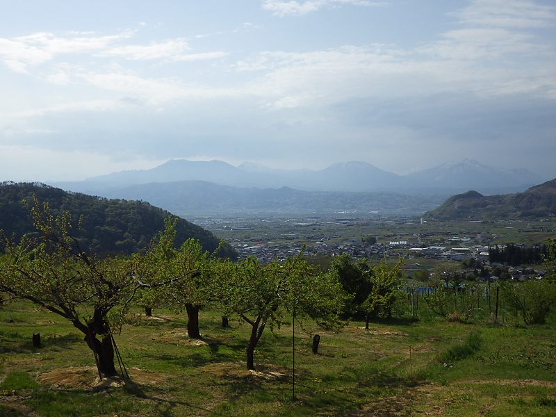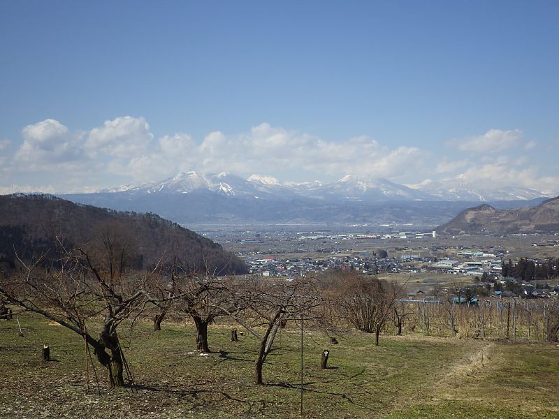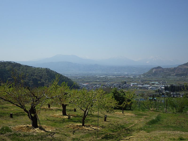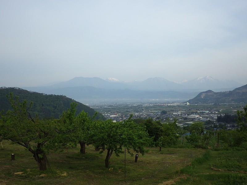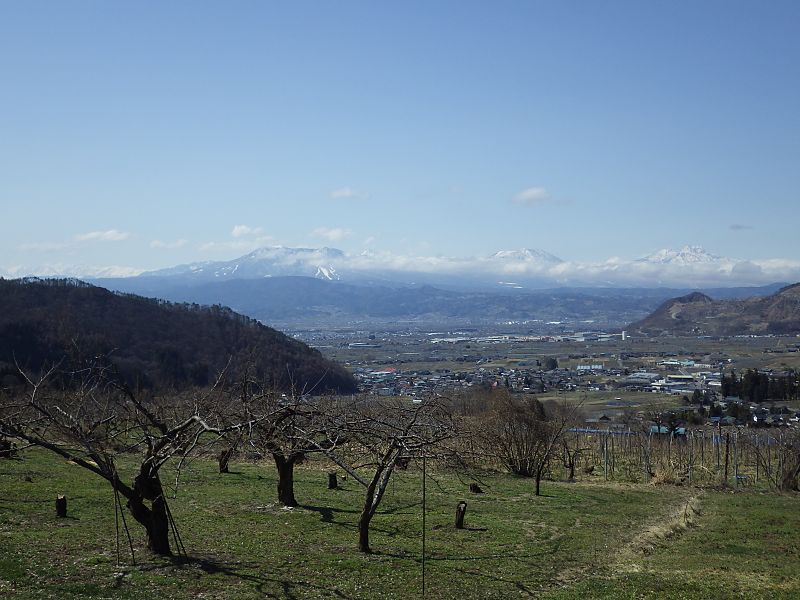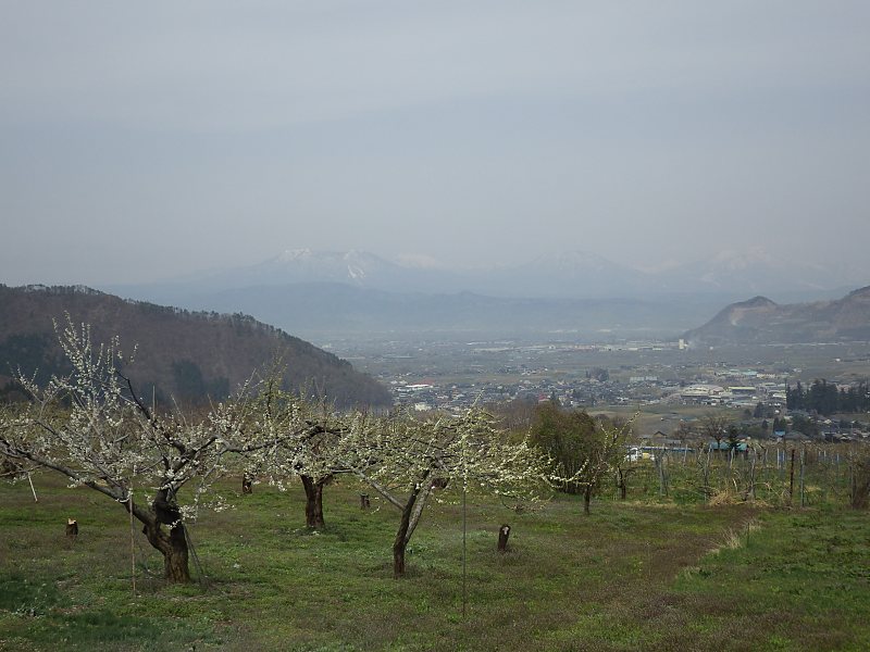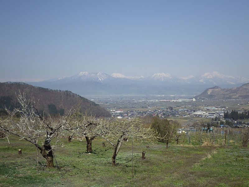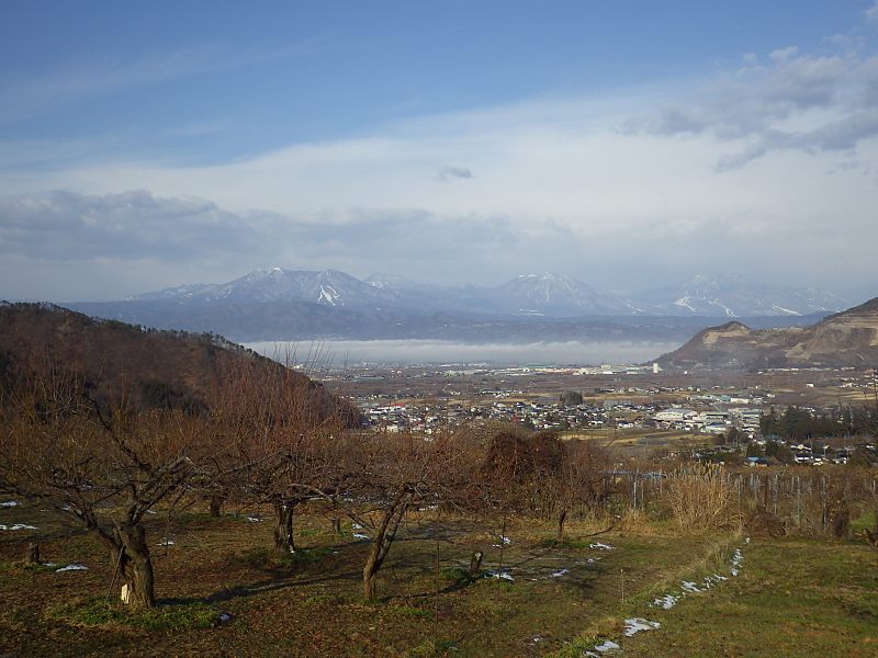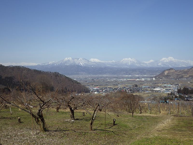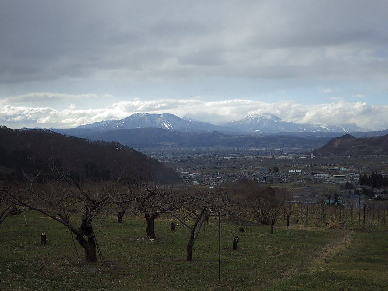 北信五岳全体が靄に覆われているような景色です ワインブドウの畑にも雪がまだ少し残っています |
