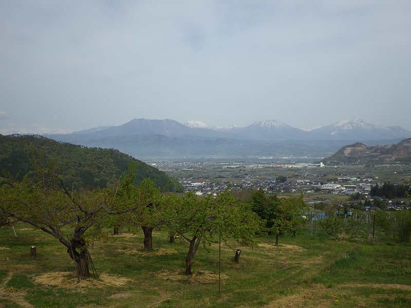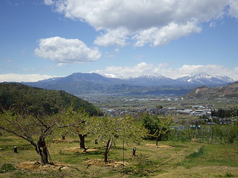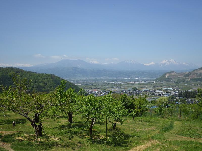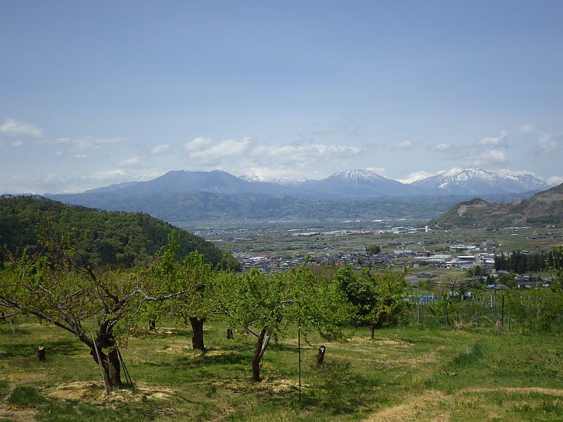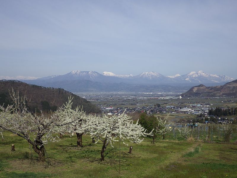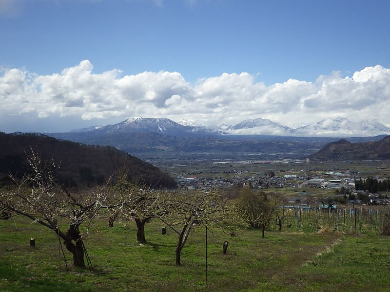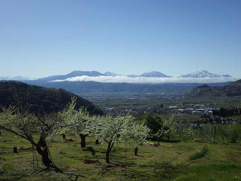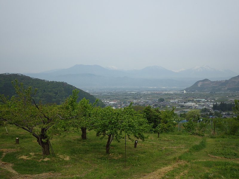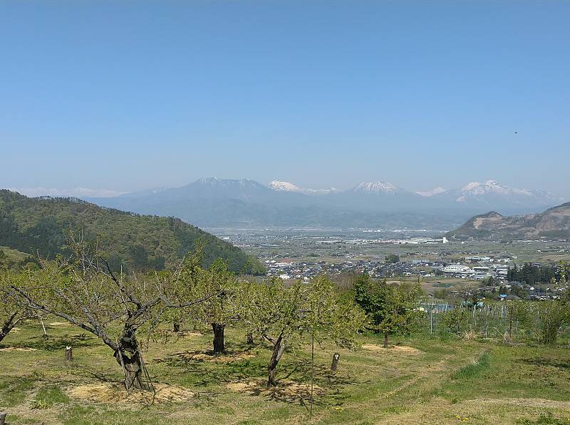 北信五岳全体が靄に覆われているような景色です ワインブドウの畑にも雪がまだ少し残っています |
