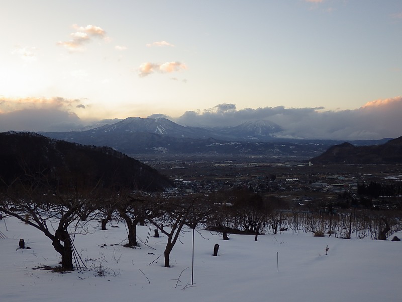 北信五岳を隠していた雲が夕方になって少し薄れ飯縄山と黒姫山が姿を現しました 雨水を過ぎても気温は低いので畑の雪はあまり減りません 明日からの三連休はまた寒波が襲来しそうです |