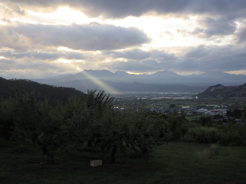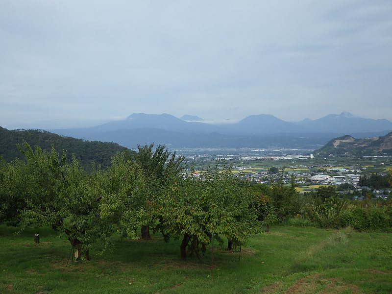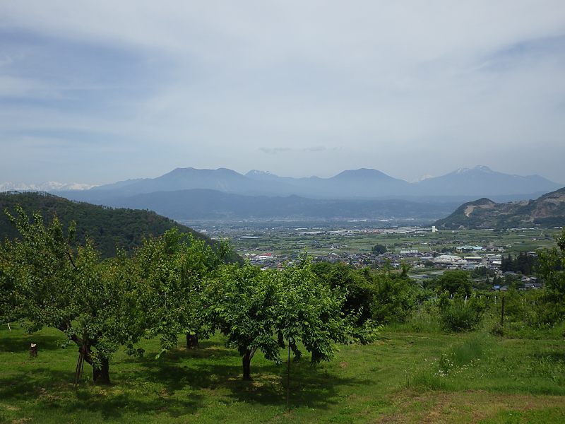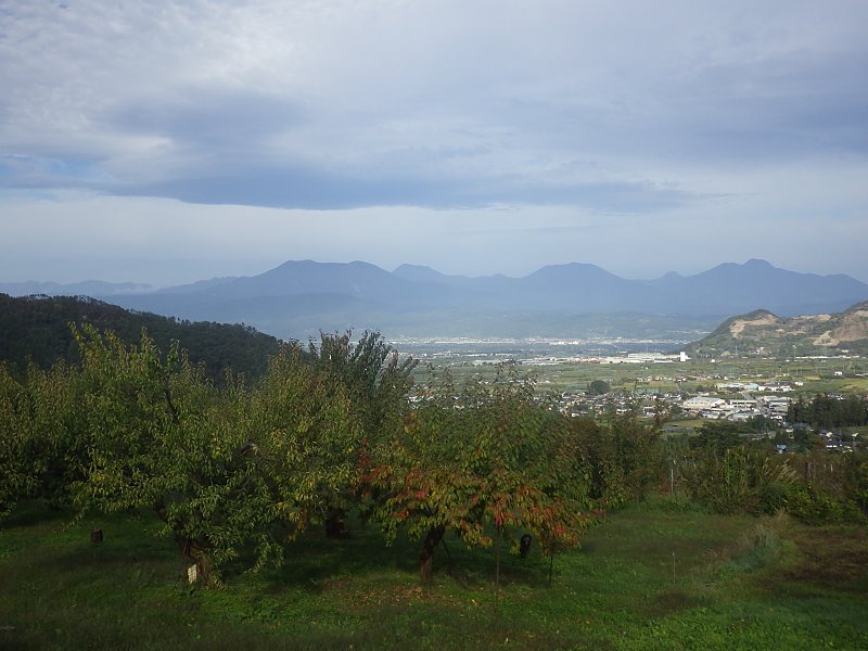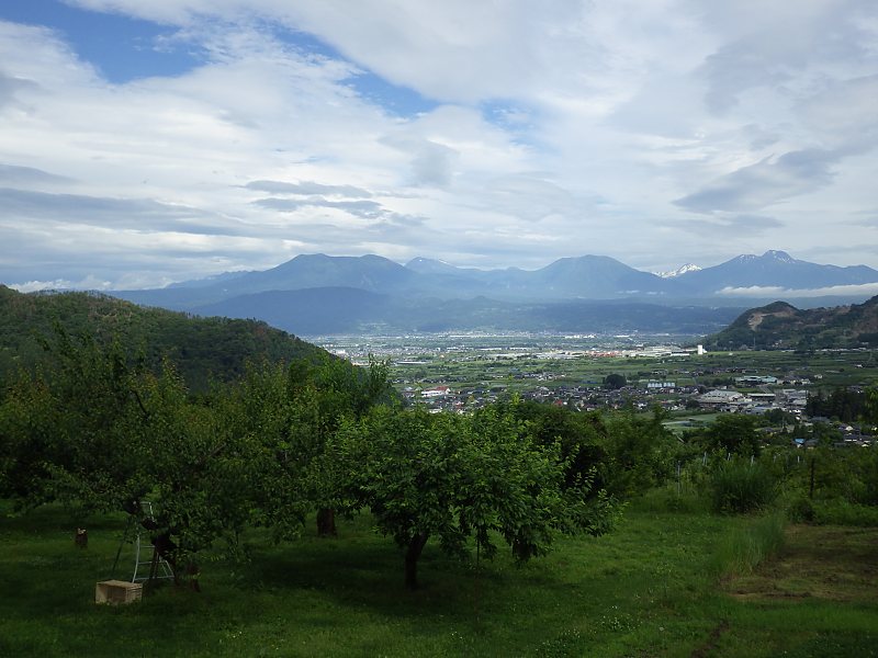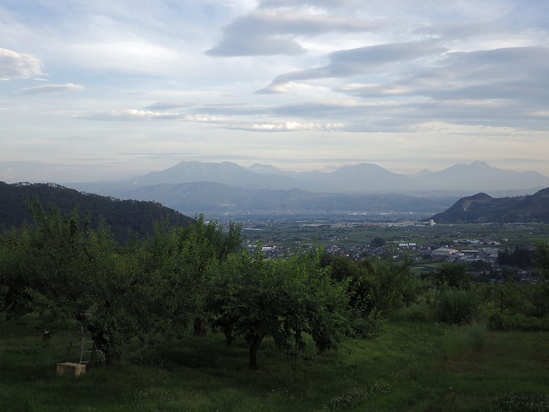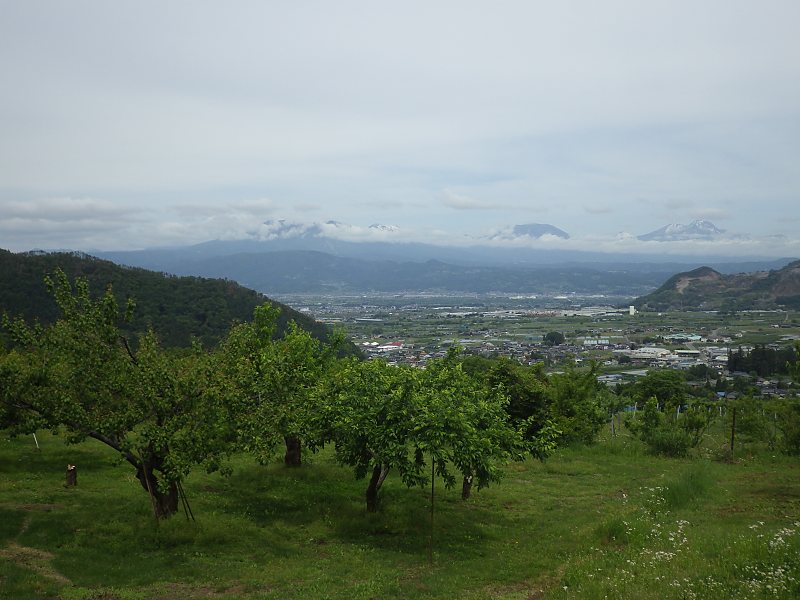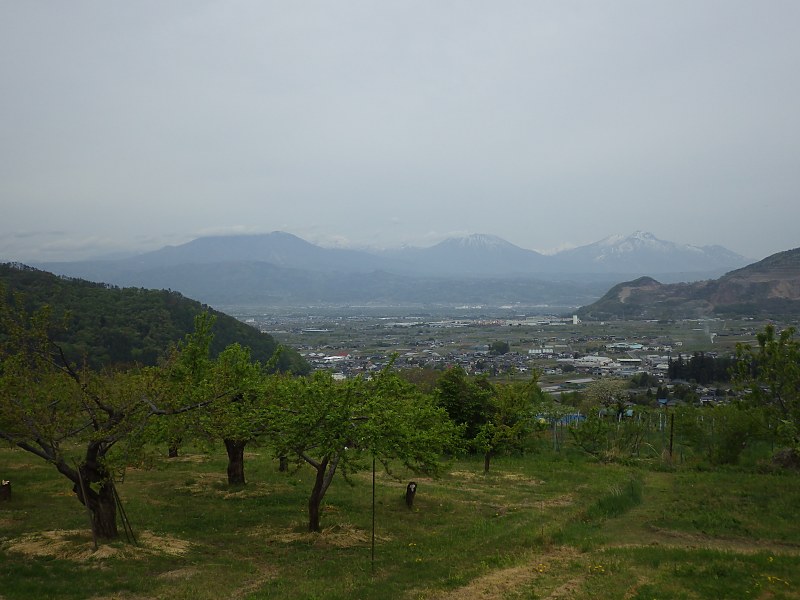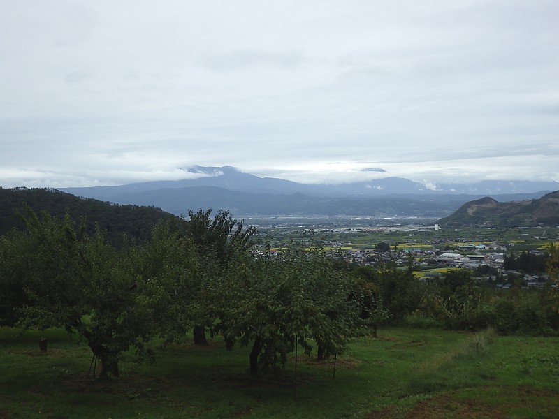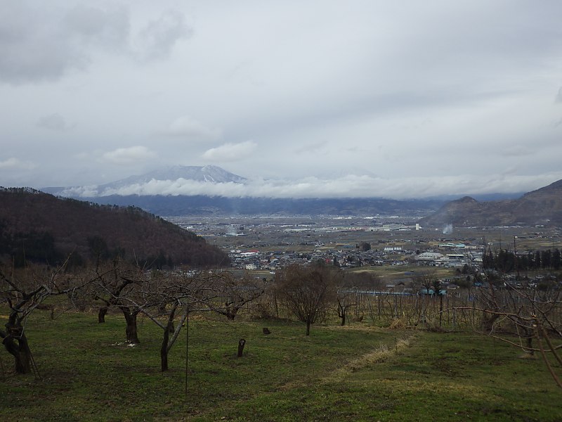 雲の間に飯縄山がうっすらと見えています 周囲に燃え移る心配がないので、雨模様でも果樹園で剪定枝を燃やす煙があちこちで上がっています |