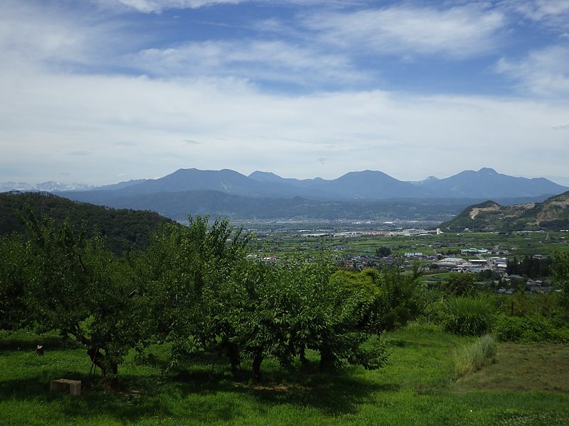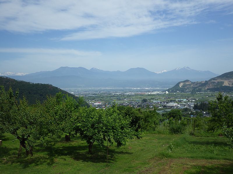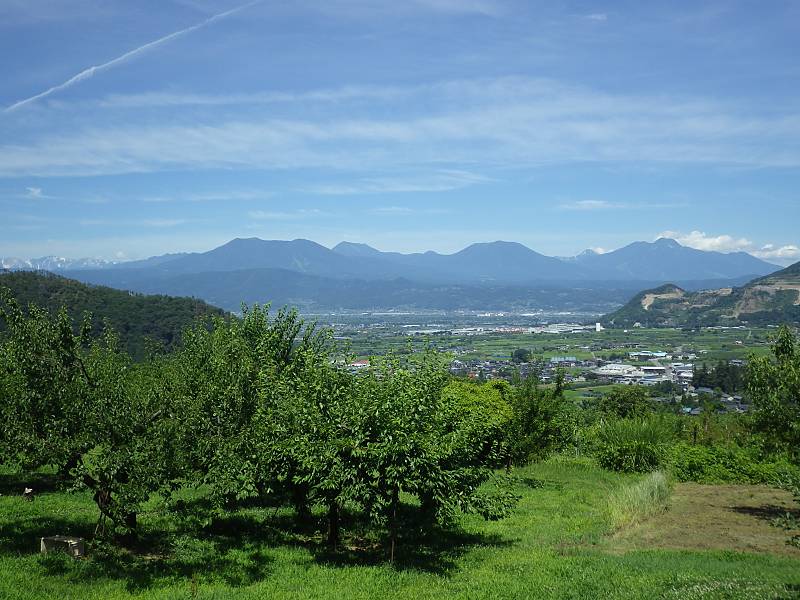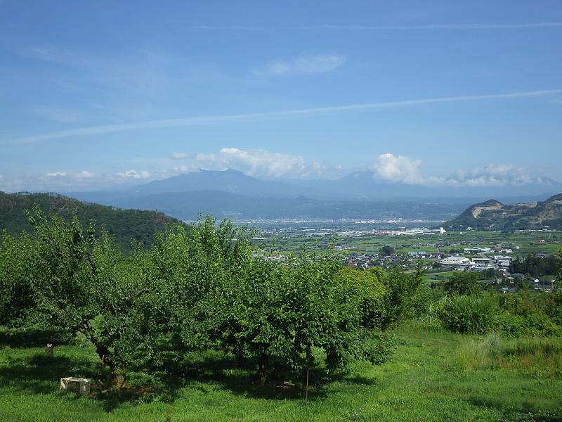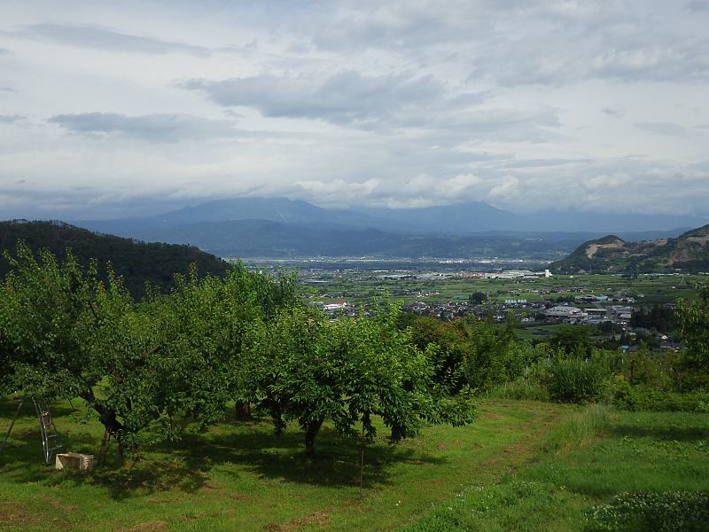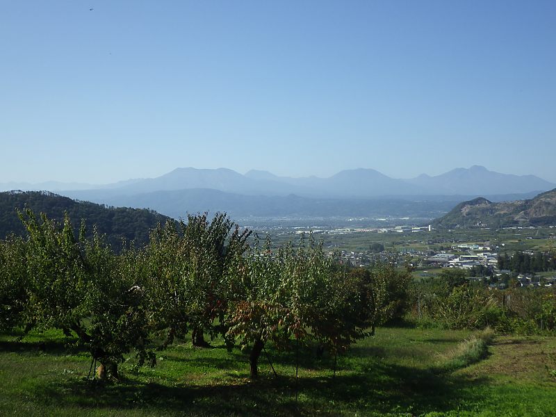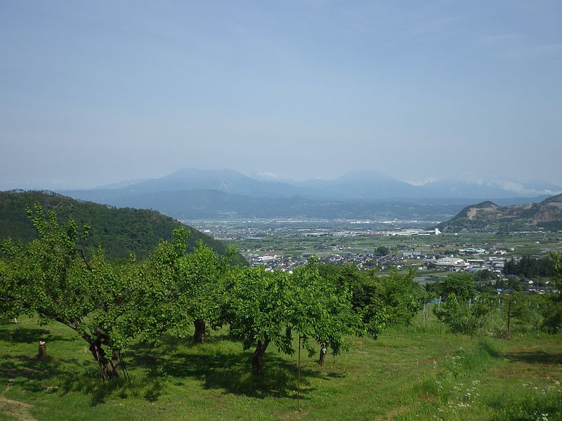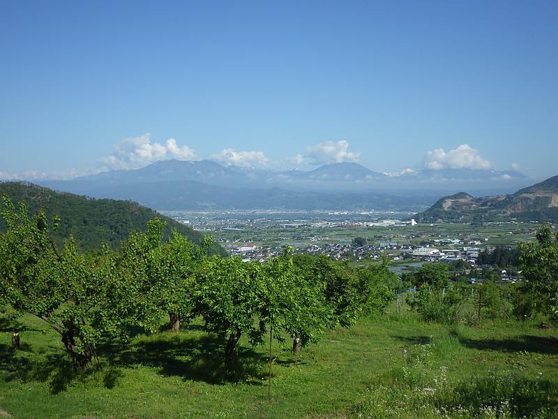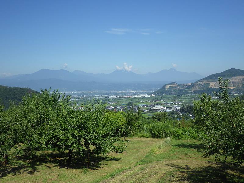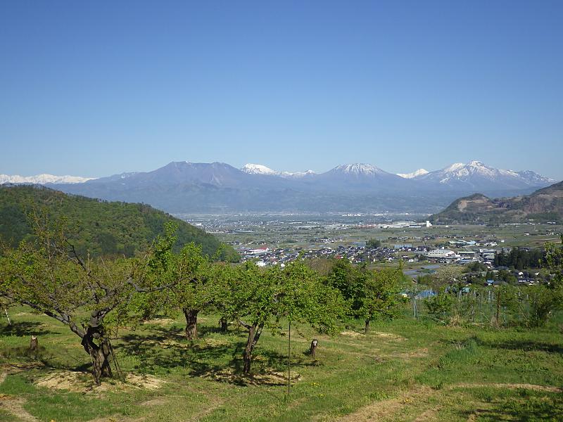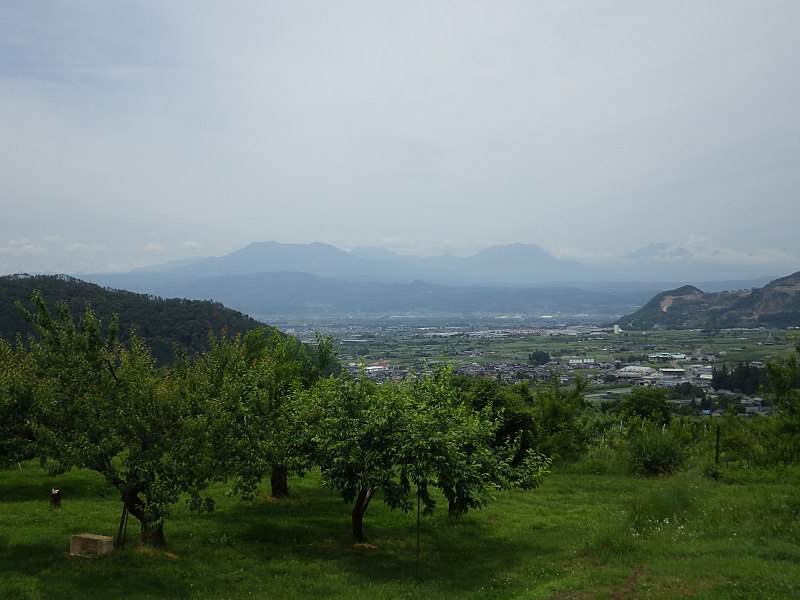 雲の間に飯縄山がうっすらと見えています 周囲に燃え移る心配がないので、雨模様でも果樹園で剪定枝を燃やす煙があちこちで上がっています |