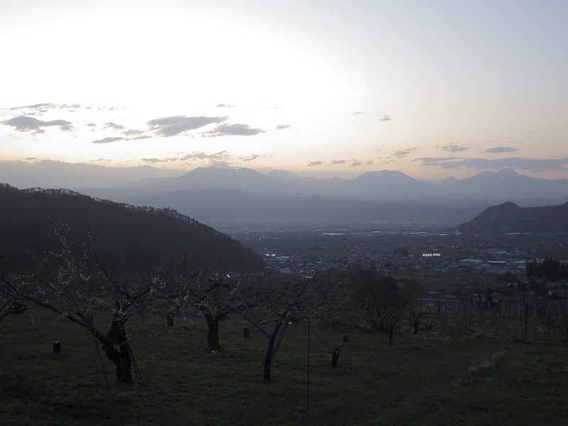 日が沈み北信五岳がうっすら浮かんでいます 台風並みの強風が吹き荒れ、ワイナリーの軒下にあったステンレス製の円筒型醸造タンクが転倒し、プラスチックコンテナが近所の畑まで飛ばされていました ウメが満開になってスモモの花も開き始め、リンゴの蕾が膨らんできました |