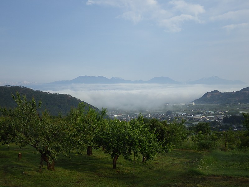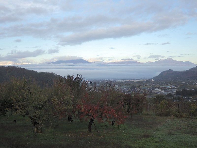 千曲川上空に滞留している厚い霧の上に姿を見せる北信五岳に朝日が当たっています 霧が消えても雲が多くすっきりしない天気でした 【最低気温:4.6℃】【最高気温:18.9℃】 |
